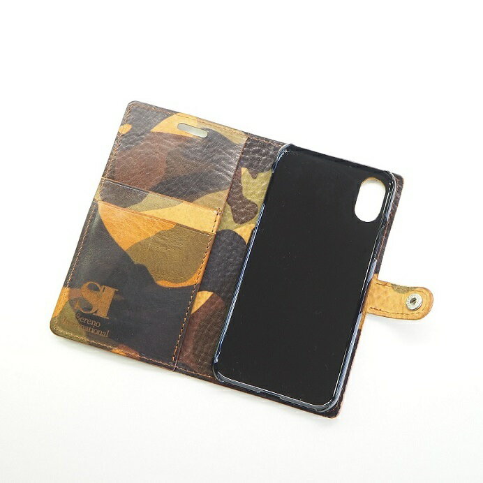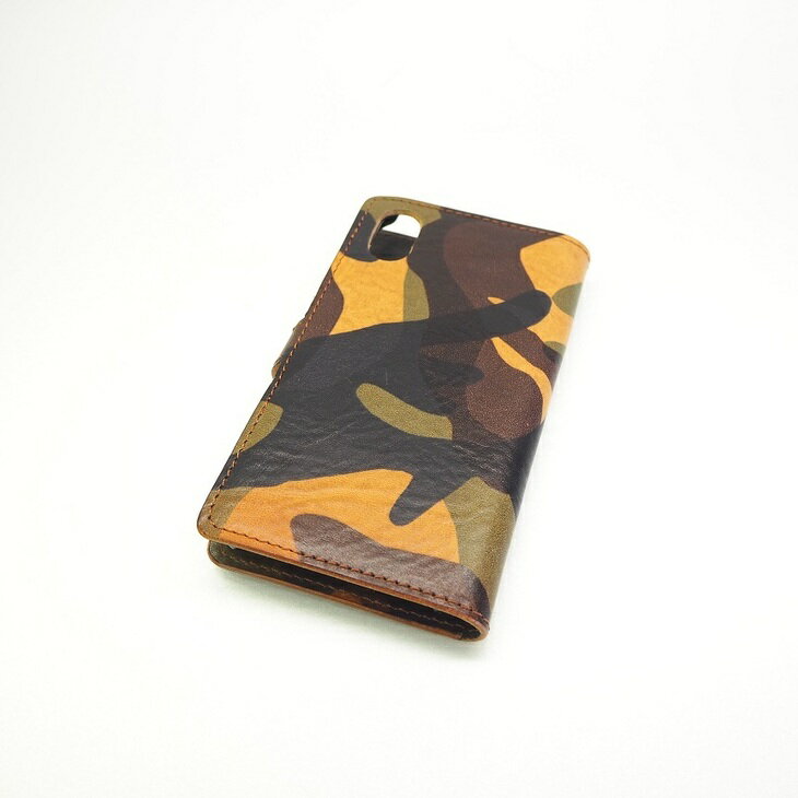 ユニセックスに使える飽きのこないシンプルなデザインで斬新な迷彩柄が魅力のイタリア製牛革使用の手帳型iPhone X/Xs専用ケース。
