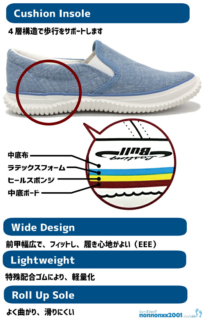 幅広ゆったり設定 EEE よく曲がるロールアップソール 軽くてラクラク特殊配合ラバー 4層構造クッションで疲れにくい いまどき珍しい昔ながらのバルカナイズ製法。
